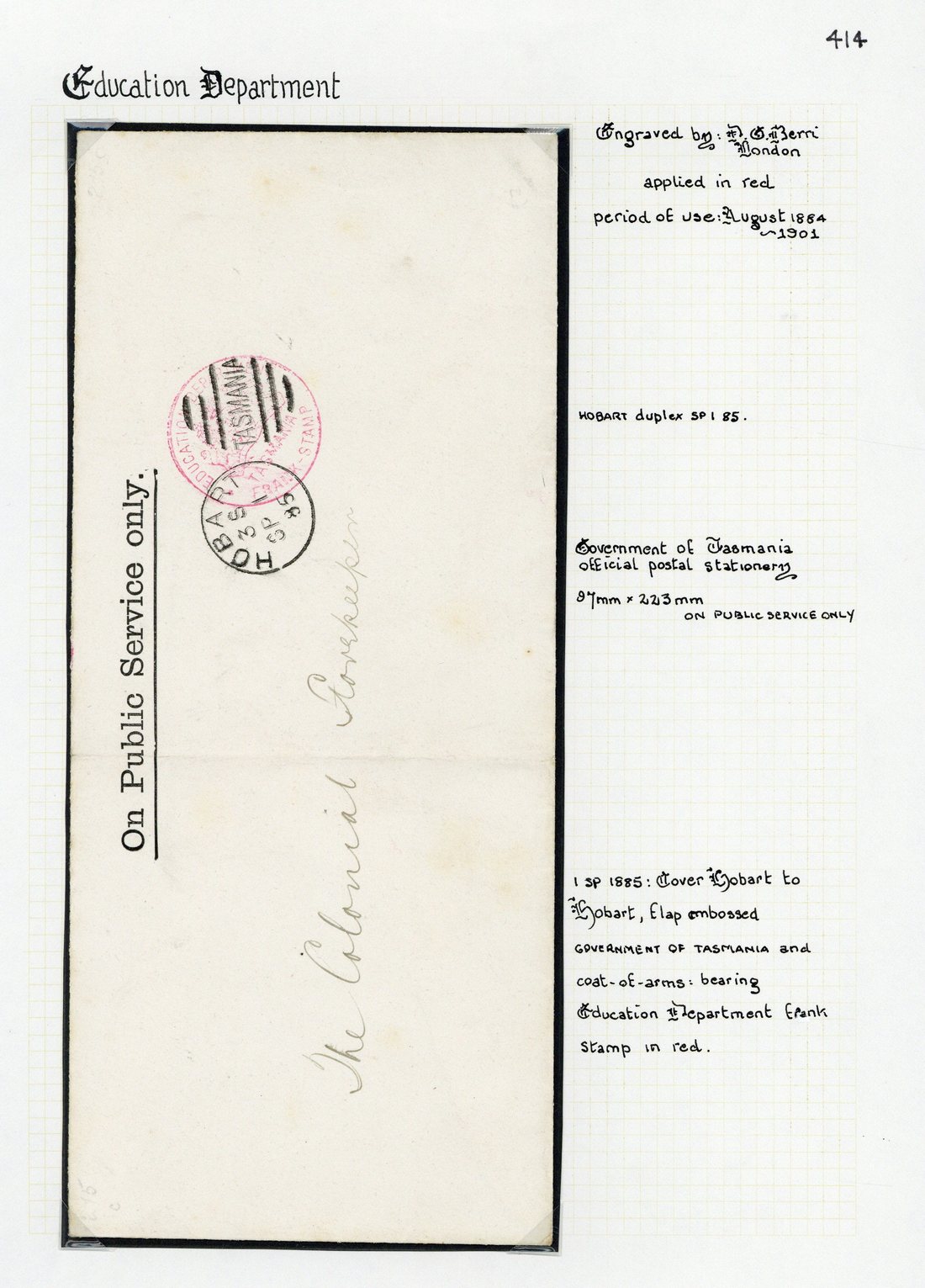 1885 (1 Sept.) official envelope (223x95mm.) addressed to the Colonial Storekeeper, showing "education department/Arms/tasmania/frank stamp" in red cancelled by Hobart duplex; and 1887 (3 Aug.) official Education Department, Hobart envelope (folds), addressed to Spring Bay, showing "education department/Arms/tasmania/frank stamp" in red cancelled by Hobart duplex