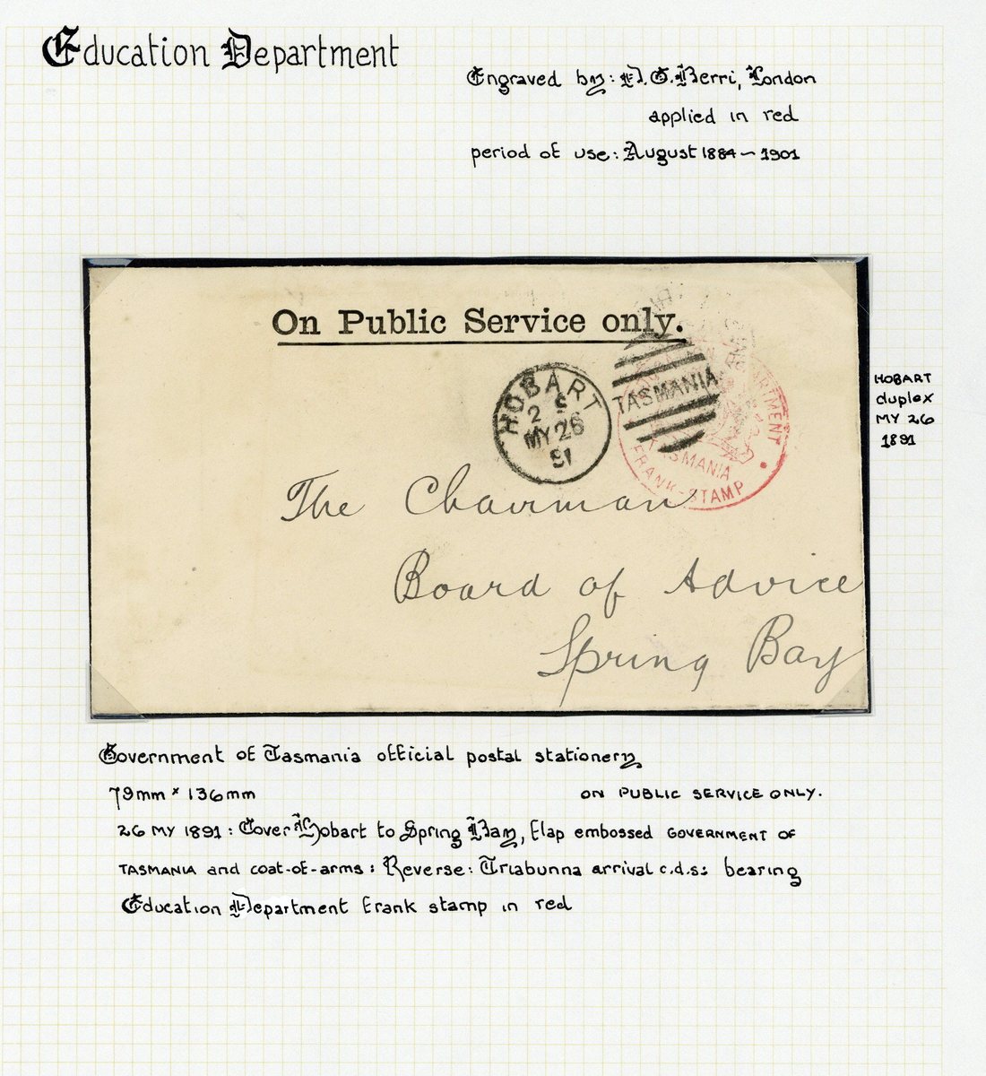 1891 (26 May) official envelope to Spring Bay, showing "education department/Arms/tasmania/frank stamp" in red cancelled by Hobart duplex; and 1897 (24 Aug.) locally addressed official envelope, showing "education department/Arms/tasmania/frank stamp" in red cancelled by Hobart duplex; also three impressions of the Frank Stamp on separate pieces in blue, red and brownish red