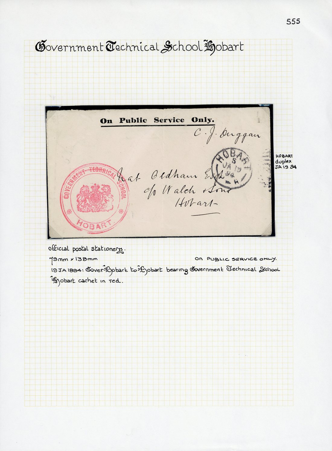1894 (19 Jan.) locally addressed official envelope (vertical fold), showing fine "government technical school/Arms/hobart" circular cachet in red and part Hobart duplex; also piece showing fine strike of "technical school/Arms/tasmania/frank stamp" in black