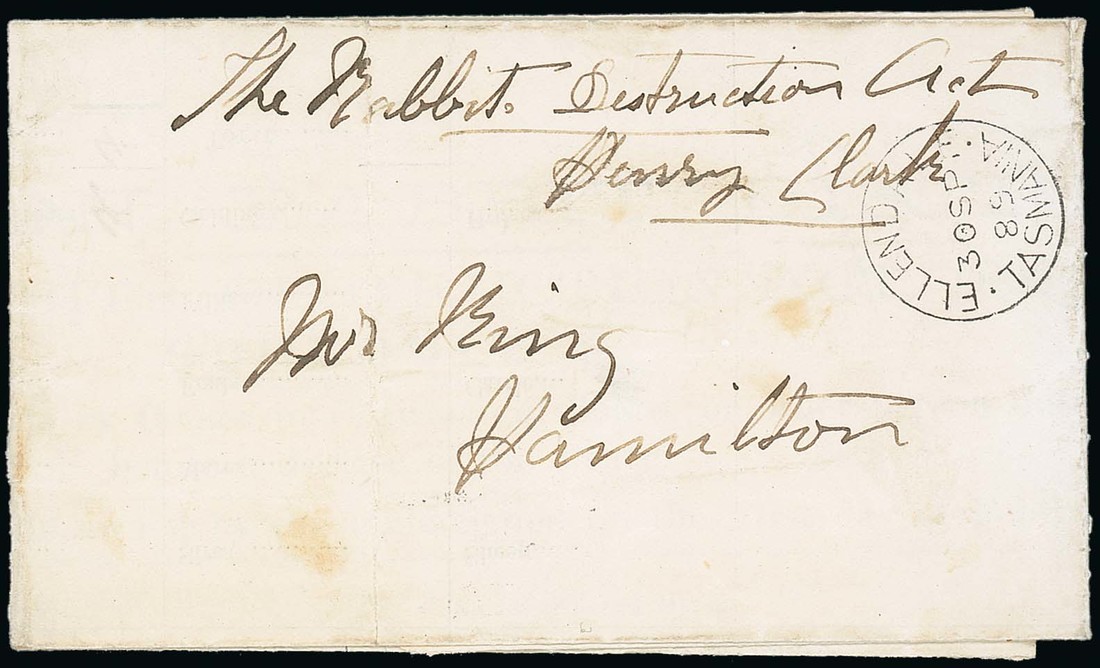 1889 (30 Dec.) Hamilton Rabbit District return on the number of Sheep, Horses and Cattle, signed by the owner, addressed to Hamilton and showing Ellendale despatch c.d.s. Photo