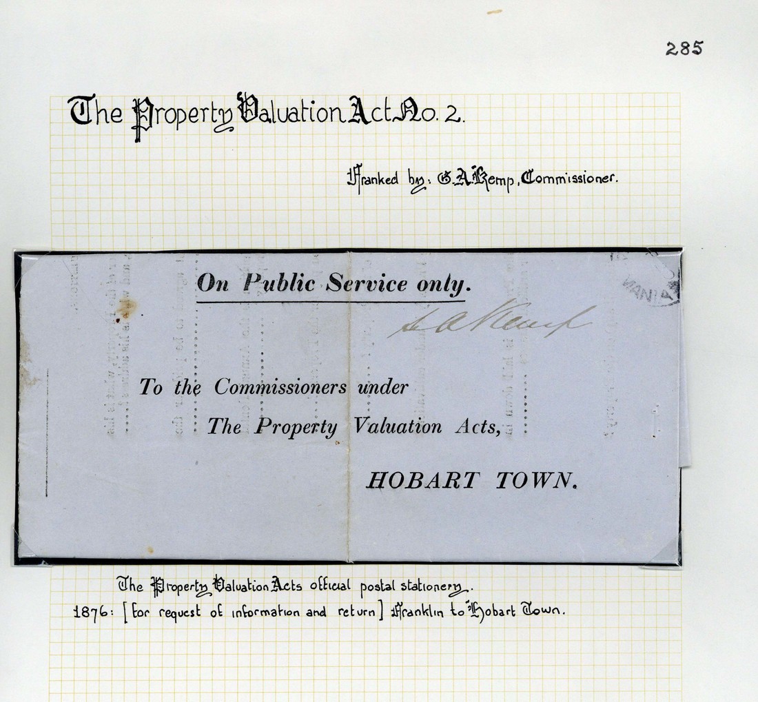 1876 (Sept.) printed official request addressed "To the Commissioners under, The Property Valuations Act, Hobart Town" from Franklin and signed by Commissioner; 188? official envelope from Nubeena addressed to The Clerk of Petty Sessions at Premandena and signed by the Presiding Magistrate; 1896 (3 Dec.) official envelope (240x164mm.; faults) from Launceston to the Bailiff at Deloraine and signed by the Clerk of the Peace; 1897 official envelope from Hobart to Lovett and signed by the Recorded of Titles; also 1903 official Law Department, Hobart, Tasmania envelope (faults) to Evandale bearing Pictorial 4d., and 1906 Solicitor-General's Chambers, Hobart, Tasmania OHMS envelope to Little Swanport bearing Pictorial 2d. perforated "T"