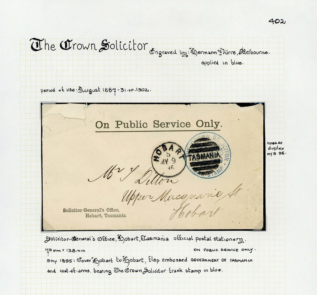 1895 (9 May) and 1902 (20 Aug.) official Solicitor-General's Office, Hobart, Tasmania envelopes, the former (small faults at to) addressed locally, the latter to Launceston, both showing "the crown solicitor/Arms/tasmania/frank stamp" in blue cancelled by Hobart duplex and c.d.s.
