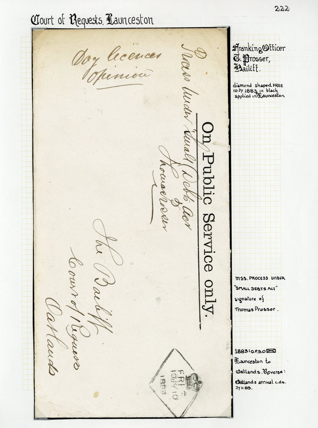 1883-1902 official envelopes (6) from Launceston, Strahan, Queenstown (2), Carnarvon and Hobart, all signed by the Bailiff (5) or Deputy Registrar of the Court, the envelope from Launceston showing "free" d.s. in black