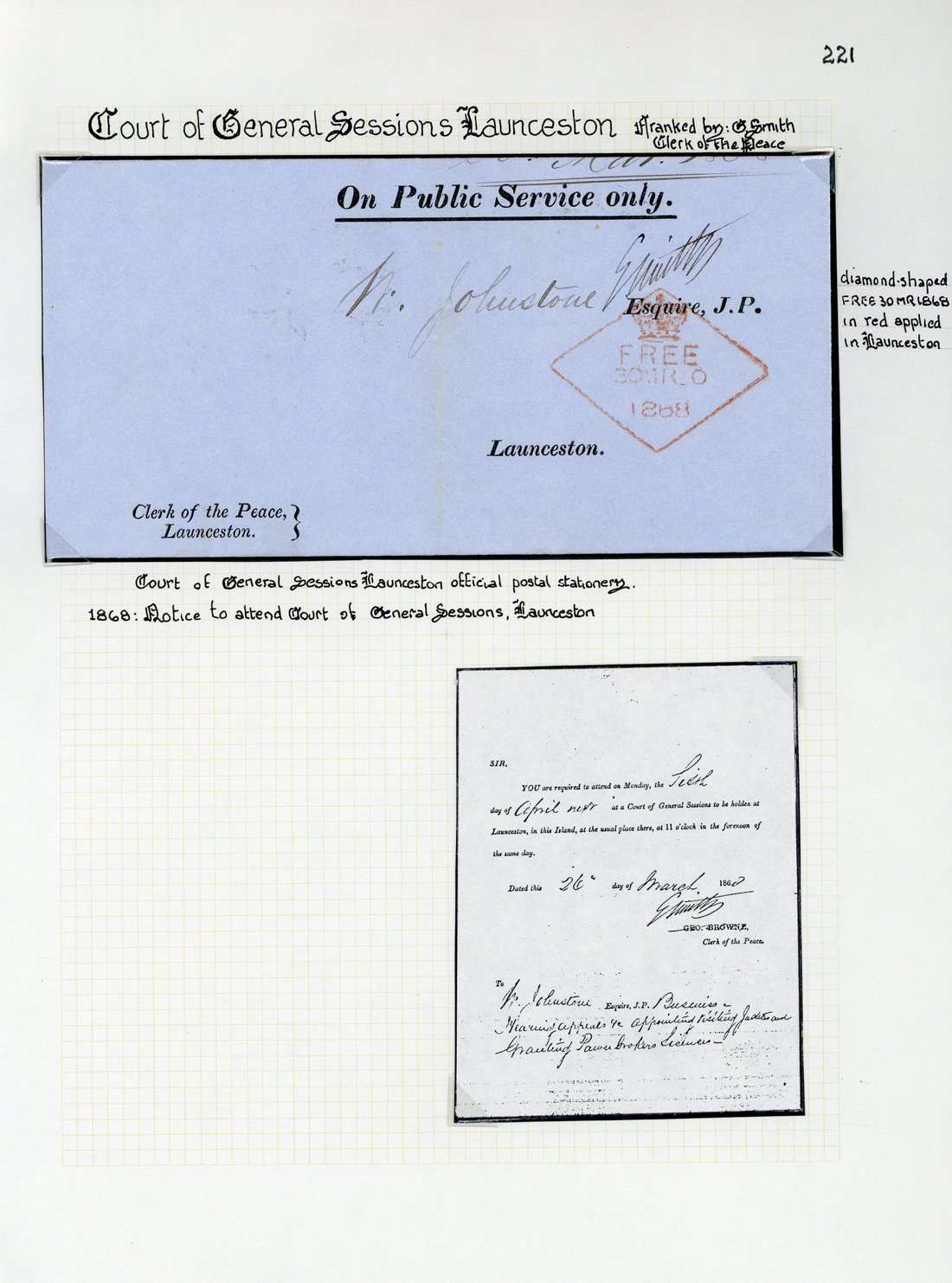 1868 official Clerk of the Peace, Launceston notice, addressed locally, signed by Clerk of the Peace and showing "free" d.s. in red; 1894 (18 Sept.) and 1902 (6 Oct.) official envelopes (the former torn along top through opening) from Carnarvon to Impression Bay and from Premaydena to Carnarvon, signed by Bailiff and Deputy Clerk of the Peace respectively