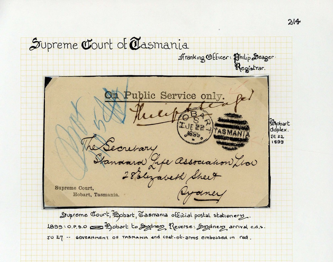 1899 (22 June) official Supreme Court, Hobart, Tasmania envelope to Sydney, signed by Registrar and showing Hobart duplex; 1899 (11 Nov.) official envelope to Hamilton, signed by Bailiff and showing Hobart duplex; 1902 (26 Mar.) official envelope (torn along top) to Impression Bay, signed by Bailiff and showing Hobart c.d.s.; and 1903 official envelope (305x164mm; faults) to Launceston, bearing Pictorial 5d. perforated "T" tied by Hobart c.d.s.