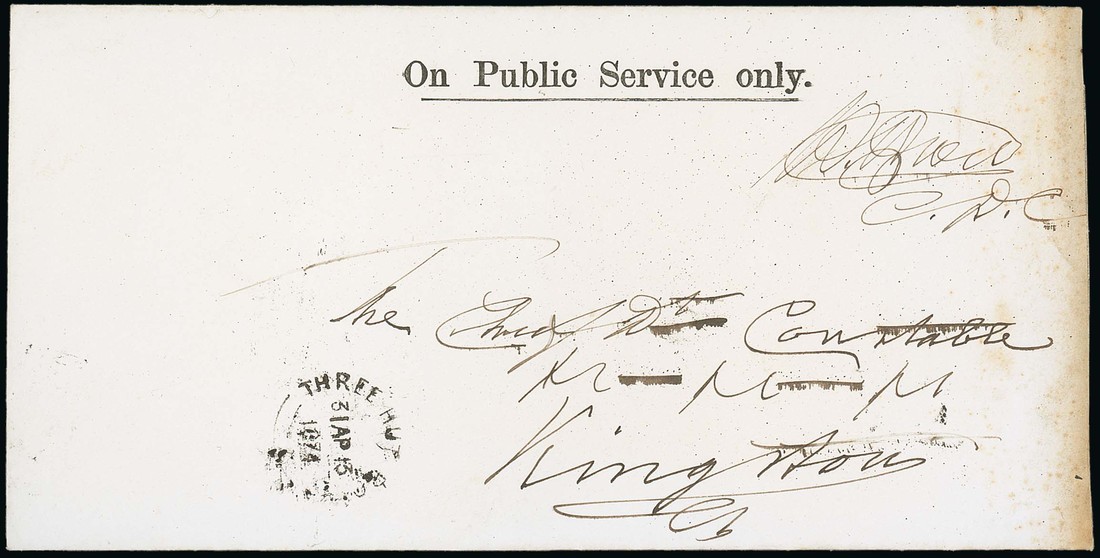 1874 (31 Apr.) official entire to the Chief Constable at Kingston, signed by Chief District Constable, showing "three hut point" double-arc d.s., the only recorded example. Photo
