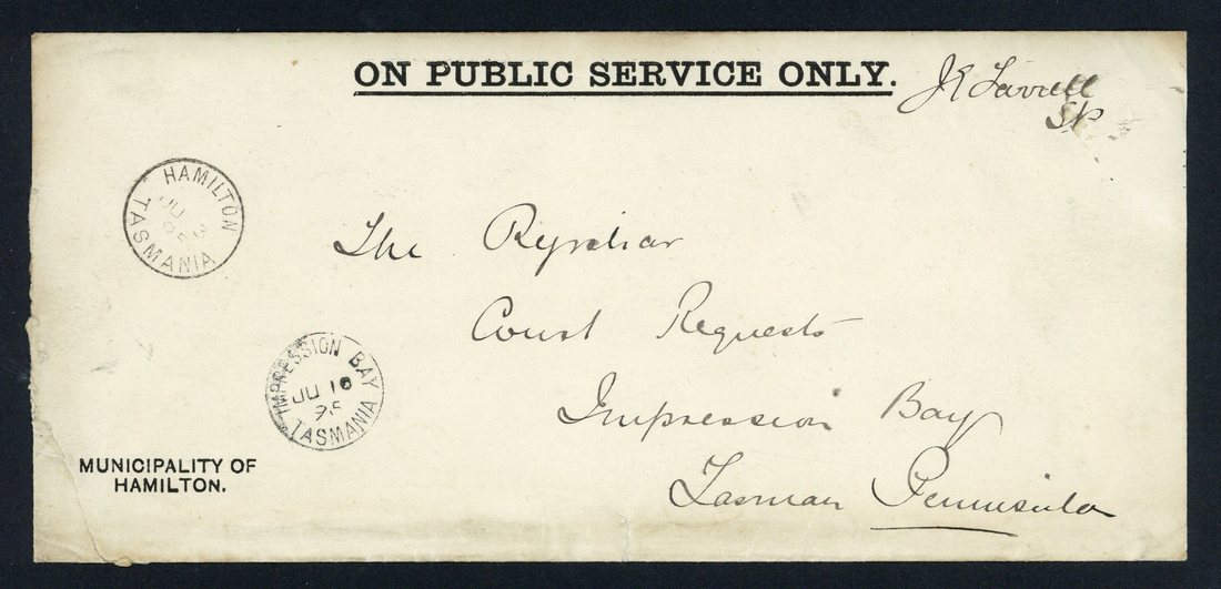 1895 (3 June) official Municipality of Hamilton envelope (228x103mm) to Impression Bay, signed by Hamilton Superintendent of Police; 1896 (23 Dec.) official envelope (225x96mm; horizontal crease and pinholes at top left) from Strahan to Hamilton, signed by Constable-in-Charge, Bailiff Court of Requests; 1895 (15 Nov.) official Municipality of Hamilton envelope (228x107mm) from Ouse to Hamilton, signed by the Sergeant; also 1907 (29 Oct.) letter from Assistant Bailiff, Victoria Valley (c.d.s. at top right) to the Bailiff at Hamilton and an unaddressed and undated envelope pre-signed by Inspector of Police, Deloraine
