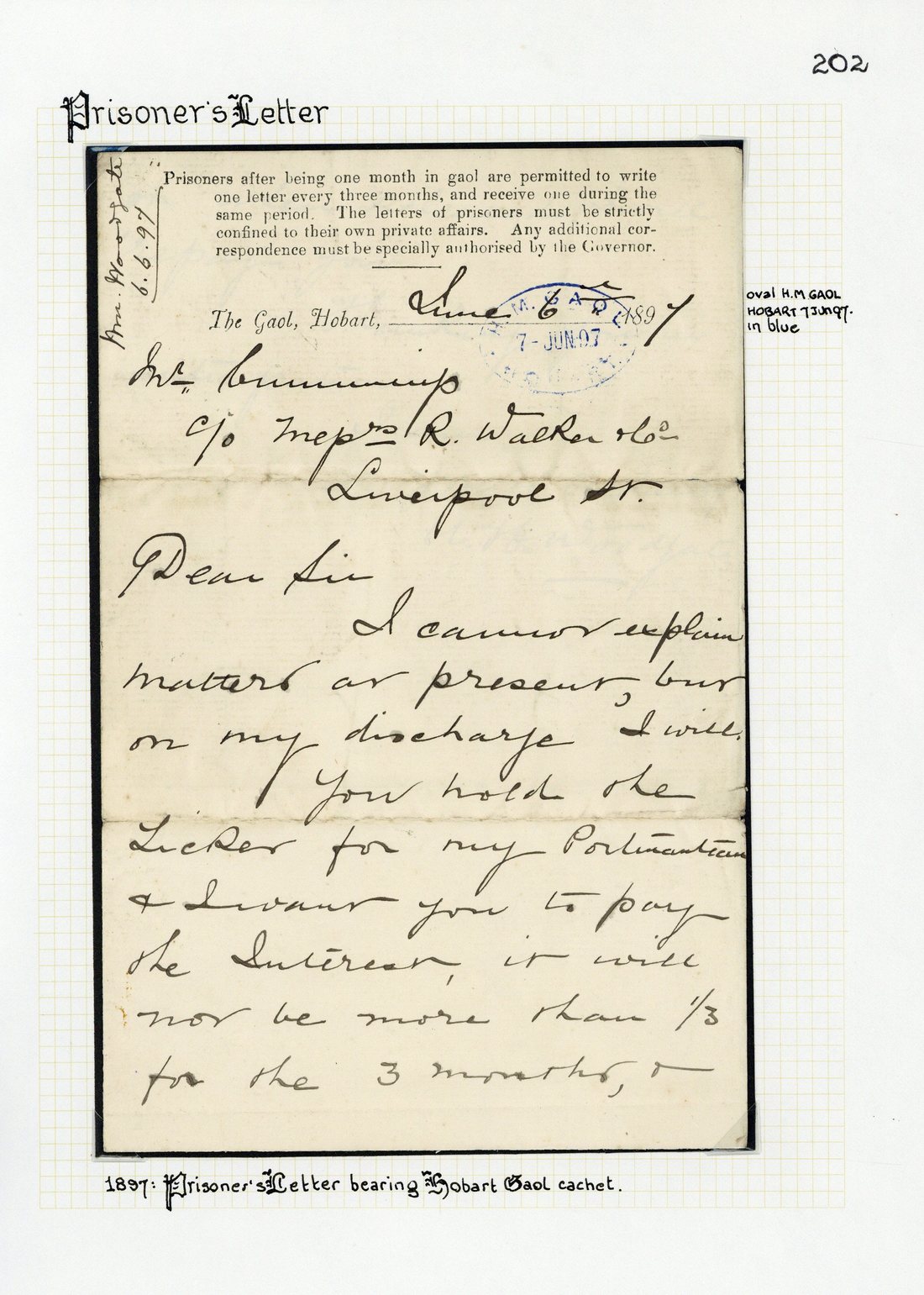 1897 (7 June) part printed prisoner's letter showing "h.m. gaol/hobart" oval d.s. in blue; also 1931 (23 Apr.) official part printed entire letter to Steppes, bearing KGV 1d. perforated "T" and showing similar datestamp