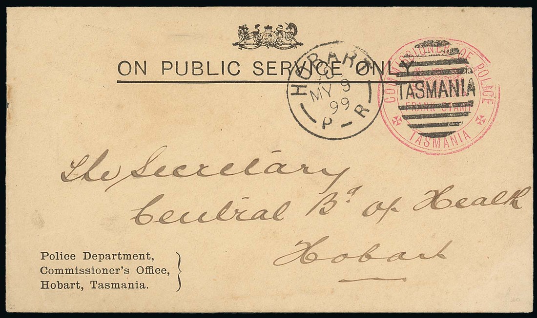 1899 (9 May) official Police Department, Commissioner's Office, Hobart, Tasmania envelope, addressed locally, showing fine "commissioner of police/Arms/frank stamp/tasmania" in red cancelled by Hobart duplex; also an impression of the Frank Stamp in violet on piece. Photo