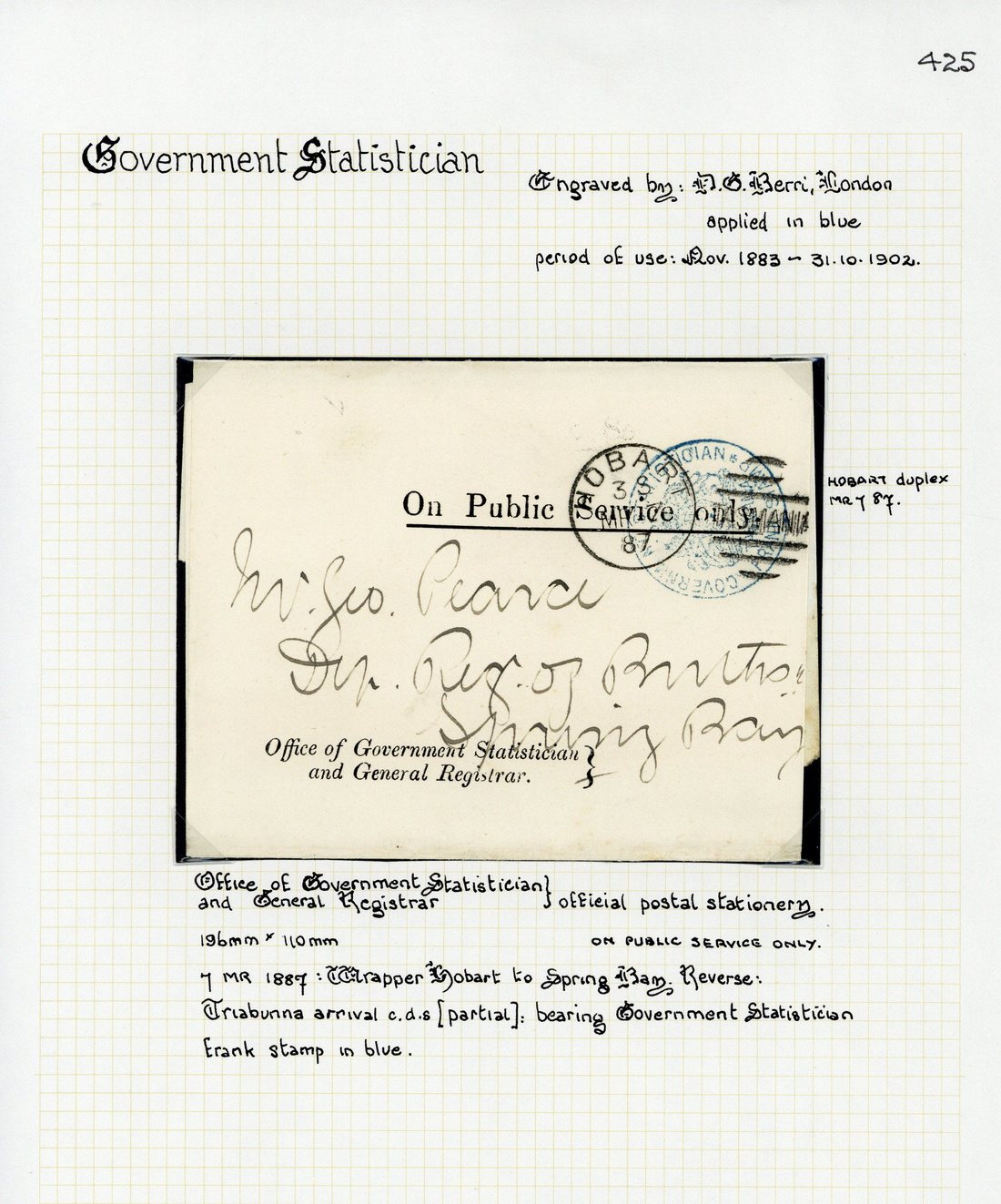 1887 (7 Mar.) official Office of Government Statistician, and General Registrar wrapper to Spring Bay, showing fine "government statistician/Arms/tasmania/frank stamp" in blue cancelled by Hobart duplex; and 1893 (13 Mar.) official Office of Registrar-General, and Government Statistician wrapper with a copy of Meteorological and Vital Statistical Bulletin, addressed to Spring Bay and showing fine "government statistician/Arms/tasmania/frank stamp" in blue cancelled by Hobart duplex