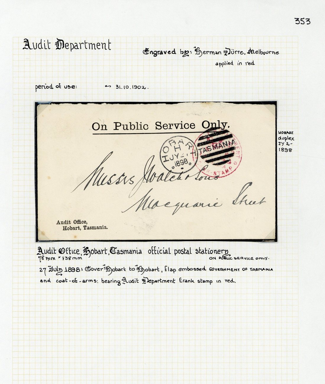 1895 (27 Feb.) official envelope (278x129mm) to Lilydale, 1897 (1 June) official envelope (277x128mm) registered to Spring Bay, 1898 (27 July) official Audit Office, Hobart, Tasmania envelope locally addressed, 1898 (7 Dec.) official envelope 279x129mm) locally addressed, 1899 (22 Nov.) official Audit Office, Hobart, Tasmania envelope (224x95mm) to Impression Bay and1900 (10 Dec.) official Audit Department, Hobart, Tasmania envelope (222x88mm; peripheral stains) with printed warning to Carnarvon, each showing "audit department/Arms/tasmania/frank stamp" in red cancelled at Hobart; also large piece (stained) showing Frank Stamp in blue