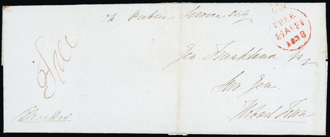 1838 (24 Apr.) official entire to Geo Frankland, the Surveyor-General at Hobart, marked "Marlbro" at lower left, showing manuscript "Free" in red ink and Crowned "free" d.s. in red; some light creases. Photo