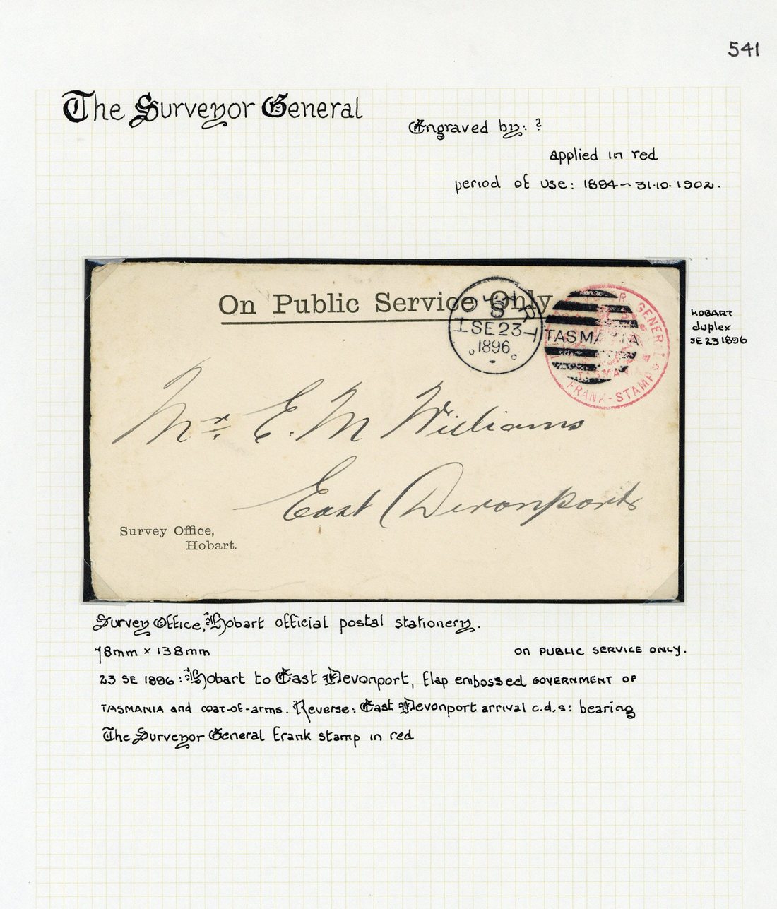 1896 (23 Sept.) official Survey Office, Hobart envelope to East Devonport, showing "the surveyor general/Arms/tasmania/frank stamp" in red cancelled by Hobart duplex; and 1898 (23 June) official Crown Lands Office, Hobart demand to pay overdue instalment (part only) to Lisdillon and re-addressed to Helvedon, showing "the surveyor general/Arms/tasmania/frank stamp" in red cancelled by Hobart duplex
