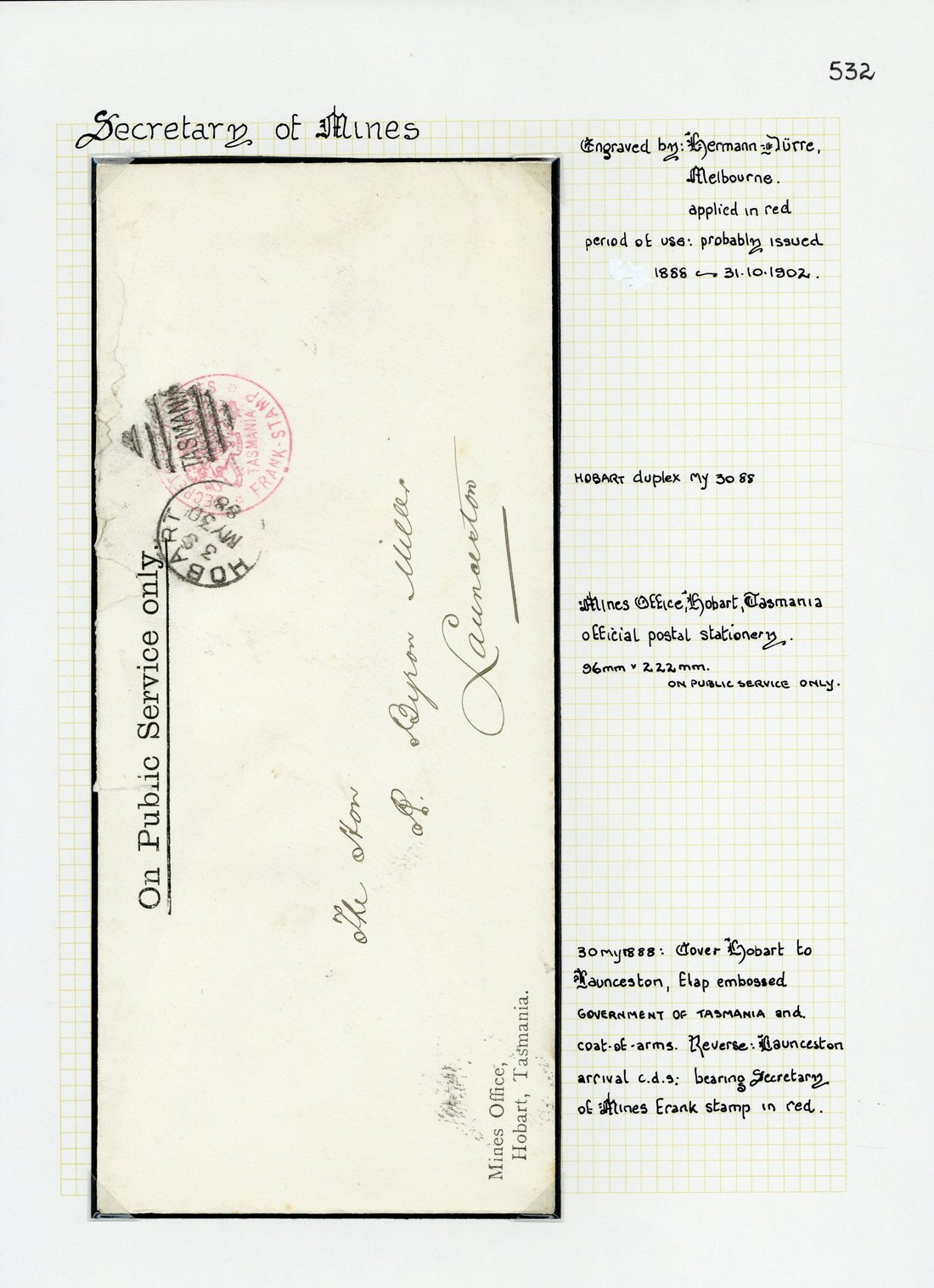 1888 (30 May) and (15 Aug.) official Mines Office, Hobart, Tasmania envelopes (222x96mm; both with faults) to Launceston showing "secretary of mines/Arms/tasmania/frank stamp" in red cancelled by Hobart duplex; 1898 (5 Jan.) official envelope (225x95mm) to Zeehan showing "secretary of mines/Arms/tasmania/frank stamp" in red cancelled by Hobart duplex; and 1899 (24 Apr.) envelope (225x95mm) to Hobart, initialled and showing Launceston duplex