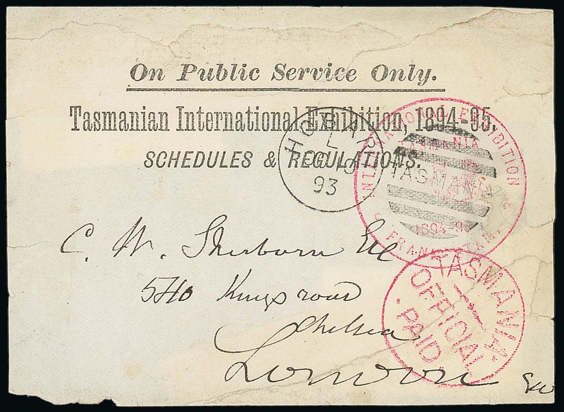 1893 (10 Oct.) official "Tasmanian International Exhibition, 1894-95/schedules & regulations" wrapper front to London, showing "international exhibition/tasmania/Arms/1894-95/frank stamp" cancelled by Hobart duplex and "tasmania/official/paid" circular h.s., both in red. Photo