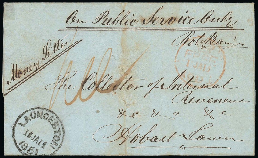 1851 (14 Jan.) official entire letter from Launceston to the Collector of Internal Revenue at Hobart, signed by the sender, marked "Money Letter", showing despatch c.d.s. and arrival "free" c.d.s. in red; also 1869 official envelope (damaged and repaired) from Hobart to Torquay, signed by William Lovett, Assistant Colonial Treasurer and Accountant, showing "free" c.d.s. with Launceston "free" d.s. on reverse, both in red. Photo for first