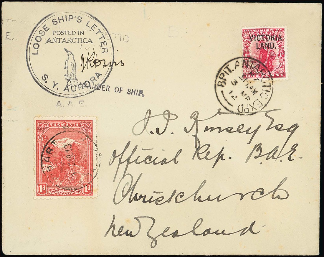 1912 (3 Mar.) envelope to New Zealand, bearing Victoria Land 1d. tied by "brit. antarctic expd" c.d.s., showing fine "loose ship's letter/posted in/antarctica/s.y. aurora/a.a.e." circular cachet, signature of J.K. Davis with "commander of ship" h.s. below, the envelope then travelled to Hobart where a Pictorial 1d. was applied and cancelled (17.3.13); also 1913 authenticating document signed by J.I. Kinsey, representative of the British Antarctic Expedition in Christchurch, relating to this envelope. Photo
