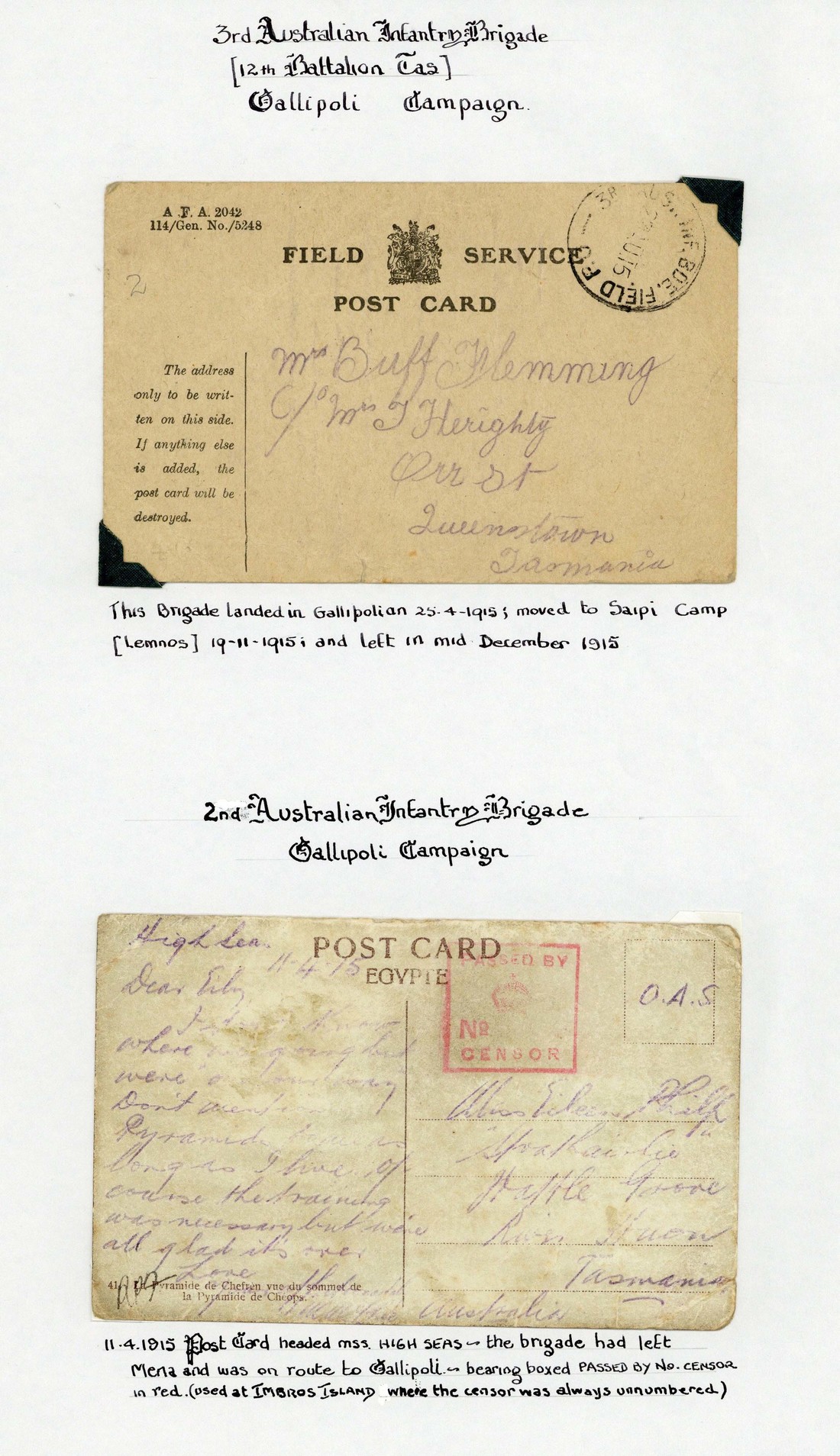 A collection from Australian forces in Middle East and the Gallipoli campaign, comprising envelopes (42), Field Service cards (7), postcards (30) and letters (7), showing a range of Army and Field P.O. c.d.s., and censor cachets, the Gallipoli items include Field Service cards from the 12th and 15th Battalions Tasmania, and a postcard from 2nd Australian Infantry Brigade. An interesting lot
