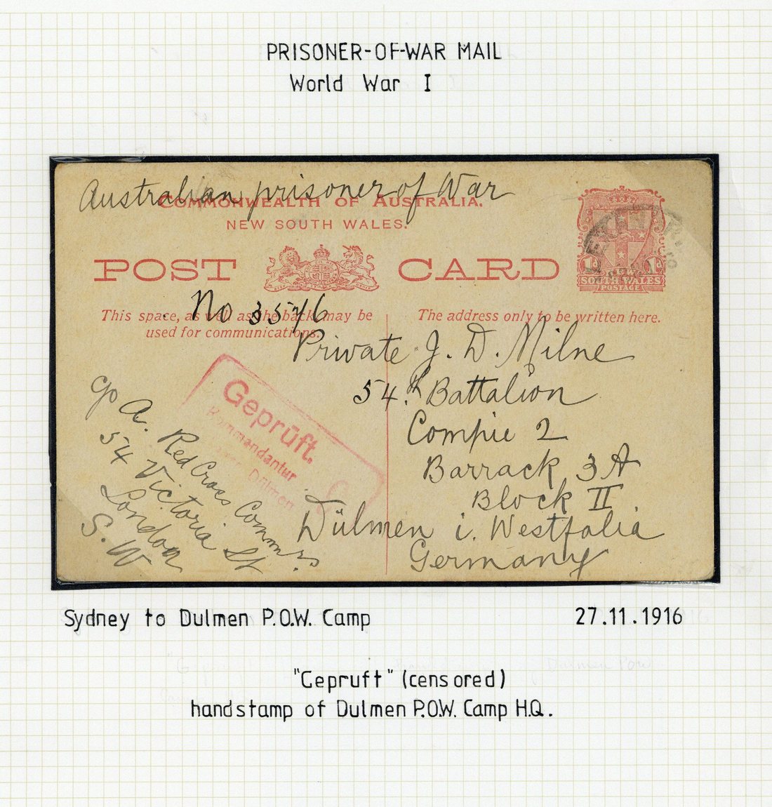 1916 (27 Nov.) NSW 1d. stationery card addressed to an Australian P.O.W. at Dulmen Camp in Germany and showing red arrival censor cachet; 1917 (23 Jan.) captured Turkish Telegram envelope (faults) to Ireland, marked "On Active Service", showing "1st aust. l.h. bde. field p.o." c.d.s. and red censor cachet; and 1918 (1 Feb.) printed 1d. "military envelope. australian imperial force, abroad" (central fold) used from London with GB 1d. to a private in the Australian 6th Infantry Brigade