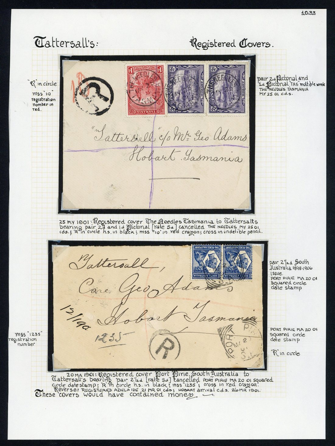 A collection of Tattersall correspondence in four albums covering the postal ban with envelopes (178), Officials (3), postcards (3), parcel labels (9) and loose stamps (73), included is 1899 Tattersall's Circulars (2) and Melbourne Cup subscritption form, pre postal ban covers (12, one "officially registered" and "....to pay" h.s. in blue, one with "officially registered" and "more to pay" h.s. and one officially registered, franked at 9d. and showing manuscript "8d to pay" probably as it contained money and not been registered by the sender), various unclaimed covers including 1899 (2) and 1904 envelopes to Victoria each with framed "unclaimed at/melbourne", loose stamps punctured "A" which stands for Adams founder and owner of lottery including Sideface 1d. on locally addressed Hobart envelope which is uncancelled with manuscript "Envelope and name of sender wanted, stamp doubtful" alongside, a range of security underprints on KGV Heads, 1902 and 1903 envelopes showing "transmission and/delivery prohibited" h.s. in red, Tasmanian Parcels Express Delivery Co. 3d. booking receipt, Tasmanian Government Railways 3d. Parcels Ticket pair on 1903 envelope plus a single 3d. and 6d. (torn in half) affixed to pieces of parcel, Tasmanian Government Railways Parcel waybills on 1902-07 envelopes (10) and a large number of Tattersall's covers to or from business fronts covering a range of people, hotel and newspaper proprieters etc. A facsinating lot well worth careful inspection