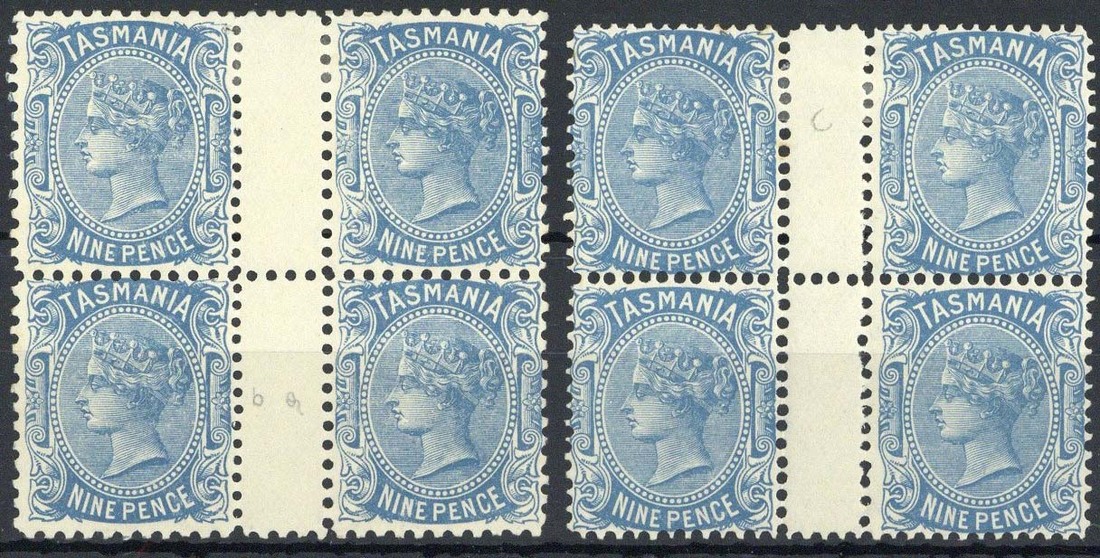 1906-07 watermark Crown over A, 9d. blue interpanneau blocks of four (2), one perf. 11 with the left-hand pair compound perf. 12½ and 11, the other with the right-hand pair compound perf. 12½ and 12, mint; the latter with one normal having two fox spots on gum. S.G. 259, 259c, 259d, £1,210+