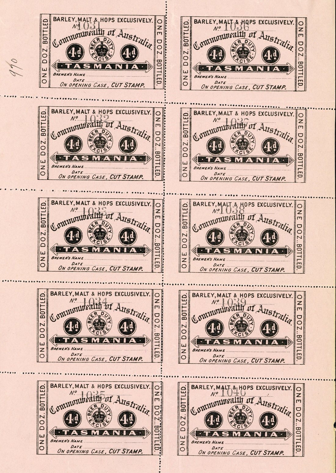 1904 Bottled Beer inscribed "barley, malt & hops exclusively", 4d. black on pink complete unused sheet (2x5), fine. Barefoot 78