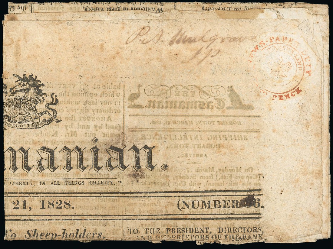 1828 (21 Mar.) "The Tasmanian" addressed to P.A. Mulgrave J.P., Police Magistrate, showing good to fine 2d. "newspaper duty" h.s. in orange (slight oxidisation); some faults, mainly along folds. Photo