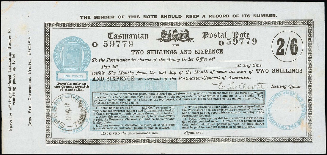 c.1912 2/6d. blue and black, watermarked "tasmania/Crown/postal note", John Vail imprint at left, showing Sideface "poundage/halfpenny" at top left, denomination at top right, "sprent/12 mr 12/tasmania" c.d.s., central vertical fold, creases at right and pinholes at top left. Photo