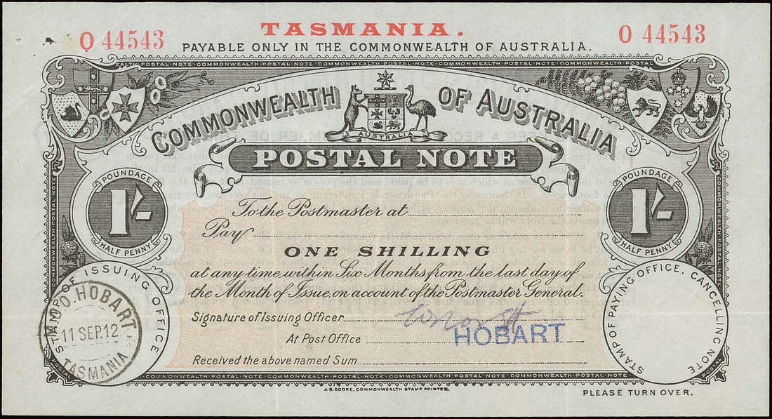 1912 1/- with State at top, Serial Numbers in red and J.B. Cooke imprint at foot, "m.o.o. hobart/11 sep. 12/tasmania" c.d.s.; pinholes at top left and some pressed creases. Photo
