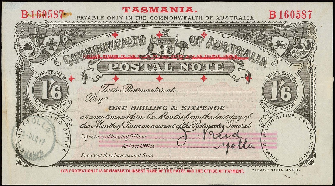 c.1917 1/6d. with "commonwealth of australia" watermark, State name at top, Serial Numbers in red, J.B. Cooke imprint and "for protection it is advisable to insert name of the payee and the office of payment" in red at foot, and "postage stamps to the value of five pence may be affixed herein" in red at top, "yolla/3 dec 17/tasmania" c.d.s.; two slightly rusty pinholes at top left and some pressed creases. Photo