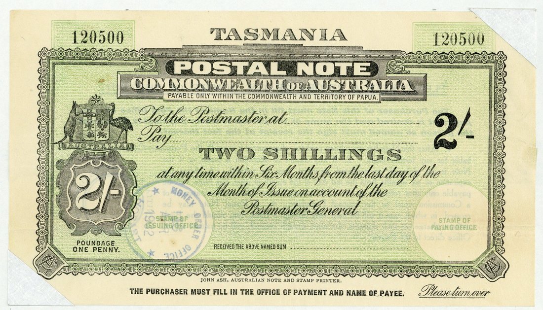 c.1931 2/- with C of A watermark, John Ash imprint at foot, "money order office/16/apr/1932/hobart" c.d.s. in blue; pinholes at top left and horizontal creases towards foot