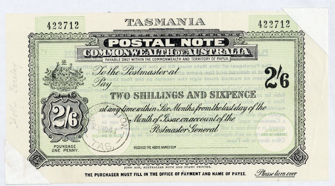 c.1931 2/6d. with C of A watermark, John Ash imprint at foot, "launceston/23 no 43/tas." c.d.s.; three pressed creases