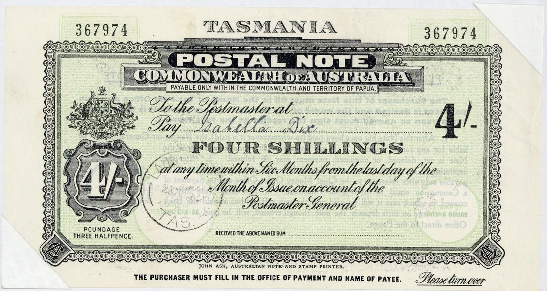 c.1931 4/- with C of A watermark, John Ash imprint at foot, "launceston/23 no 43/tas." c.d.s.; two pressed creases