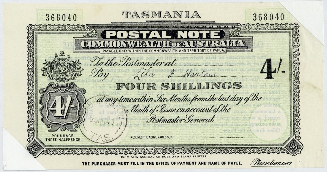 c.1931 4/- with C of A watermark, John Ash imprint at foot, "launceston/23 no 43/tas." c.d.s.; two pressed creases