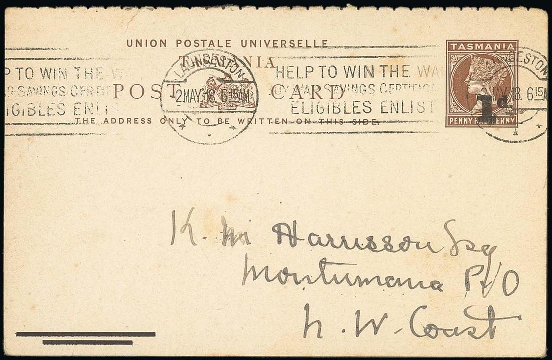 1917 1d. on 1½d. outward half as a single card, cancelled by Launceston machine d.s. for 2 May 1918, light crease across top left corner otherwise fine. Very scarce. Photo