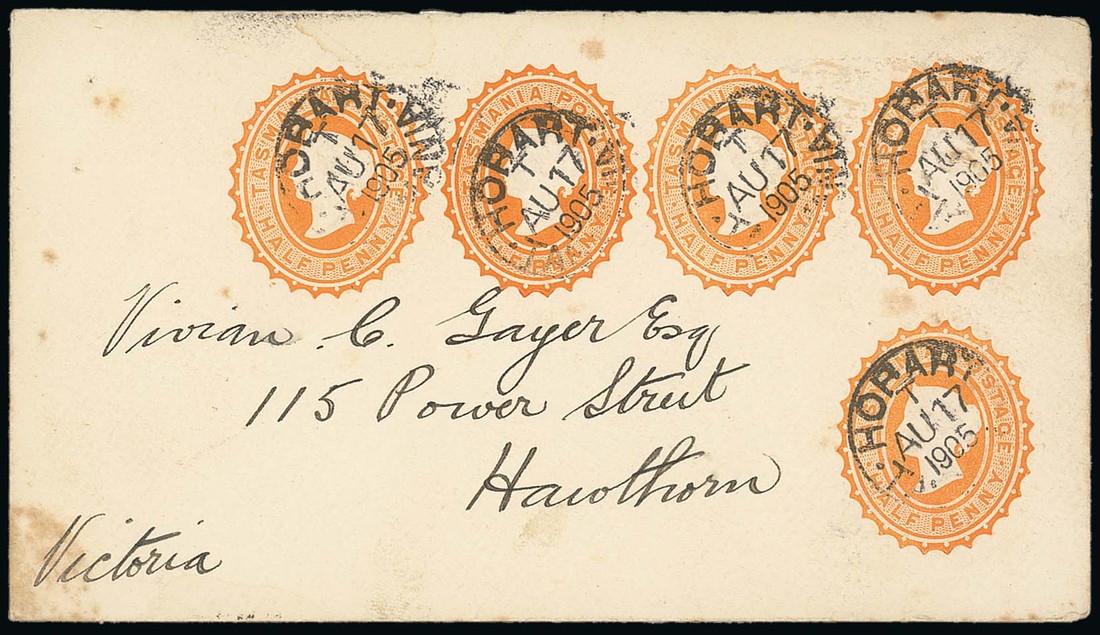 1905 (17 Aug.) ½d.+½d.+½d.+½d.+½d. orange used from Hobart to Victoria; two pinholes and minor stain at lower left, otherwise fine. Rare. Photo