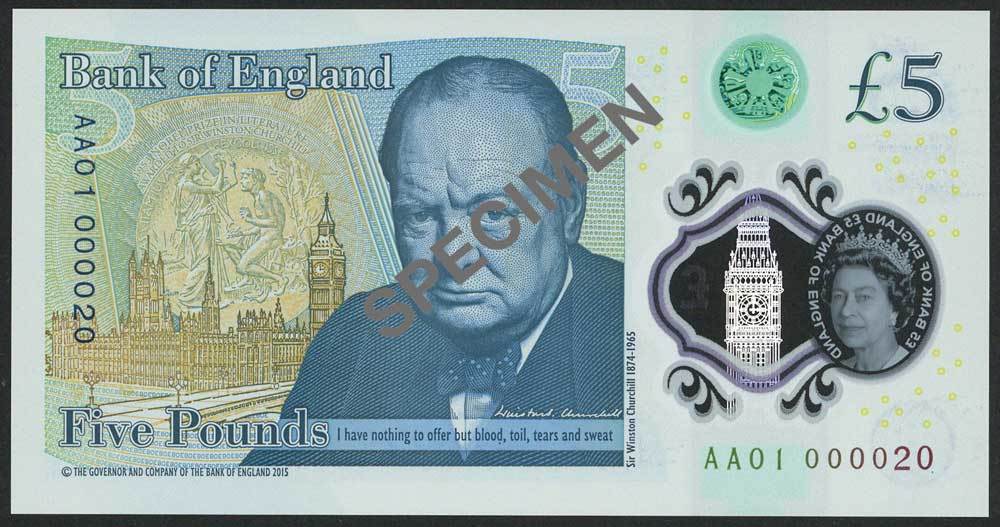Bank of England, Victoria Cleland, £5, ND (2016), serial number AA01 000020, printed on polymer, blue on green, Queen Elizabeth II at right, Bank of England building at low centre, see-through window security feature with metallic foil of Elizabeth Tower and clearly defined portrait of Queen Elizabeth II at left, reverse, Winston Churchill at centre, Houses of Parliament at left