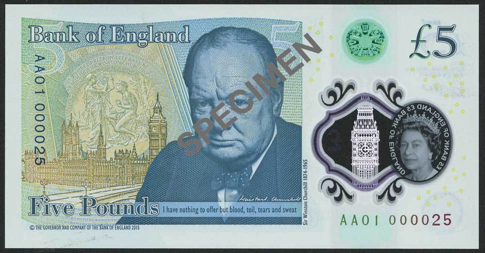 Bank of England, Victoria Cleland, £5, ND (2016), serial number AA01 000025, printed on polymer, blue on green, Queen Elizabeth II at right, Bank of England building at low centre, see-through window security feature with metallic foil of Elizabeth Tower and clearly defined portrait of Queen Elizabeth II at left, reverse, Winston Churchill at centre, Houses of Parliament at left