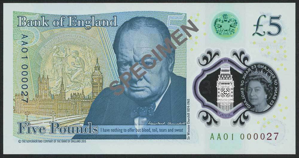 Bank of England, Victoria Cleland, £5, ND (2016), serial number AA01 000027, printed on polymer, blue on green, Queen Elizabeth II at right, Bank of England building at low centre, see-through window security feature with metallic foil of Elizabeth Tower and clearly defined portrait of Queen Elizabeth II at left, reverse, Winston Churchill at centre, Houses of Parliament at left