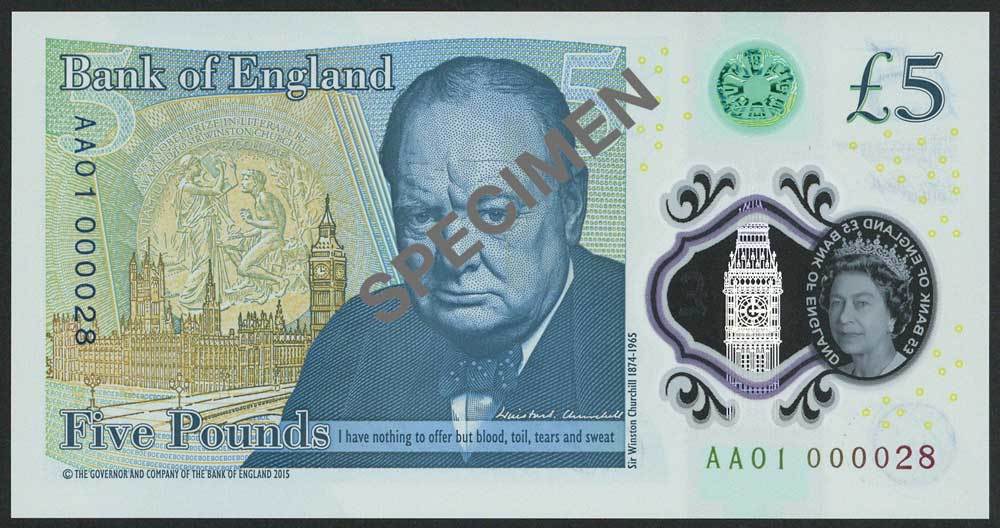 Bank of England, Victoria Cleland, £5, ND (2016), serial number AA01 000028, printed on polymer, blue on green, Queen Elizabeth II at right, Bank of England building at low centre, see-through window security feature with metallic foil of Elizabeth Tower and clearly defined portrait of Queen Elizabeth II at left, reverse, Winston Churchill at centre, Houses of Parliament at left