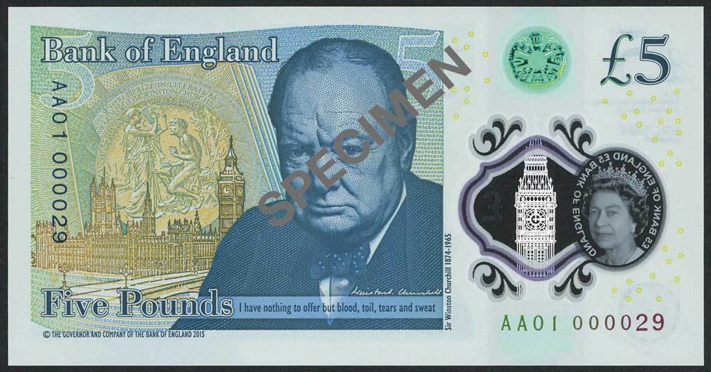 Bank of England, Victoria Cleland, £5, ND (2016), serial number AA01 000029, printed on polymer, blue on green, Queen Elizabeth II at right, Bank of England building at low centre, see-through window security feature with metallic foil of Elizabeth Tower and clearly defined portrait of Queen Elizabeth II at left, reverse, Winston Churchill at centre, Houses of Parliament at left