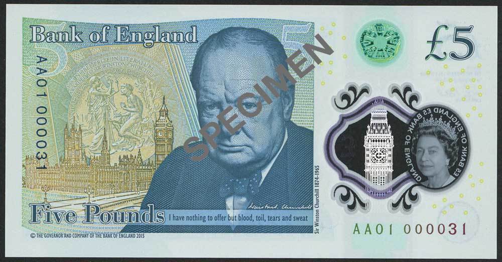 Bank of England, Victoria Cleland, £5 (2), ND (2016), serial number AA01 000031/32, printed on polymer, blue on green, Queen Elizabeth II at right, Bank of England building at low centre, see-through window security feature with metallic foil of Elizabeth Tower and clearly defined portrait of Queen Elizabeth II at left, reverse, Winston Churchill at centre, Houses of Parliament at left