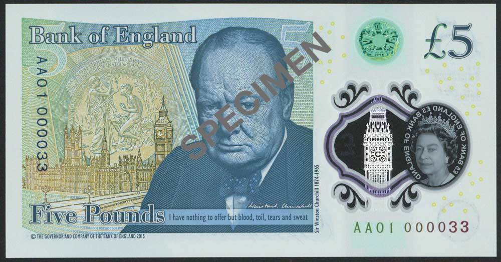 Bank of England, Victoria Cleland, £5 (2), ND (2016), serial number AA01 000033/34, printed on polymer, blue on green, Queen Elizabeth II at right, Bank of England building at low centre, see-through window security feature with metallic foil of Elizabeth Tower and clearly defined portrait of Queen Elizabeth II at left, reverse, Winston Churchill at centre, Houses of Parliament at left