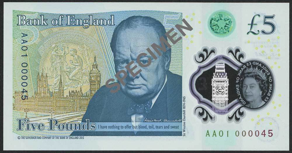 Bank of England, Victoria Cleland, £5 (2), ND (2016), serial number AA01 000045/46, printed on polymer, blue on green, Queen Elizabeth II at right, Bank of England building at low centre, see-through window security feature with metallic foil of Elizabeth Tower and clearly defined portrait of Queen Elizabeth II at left, reverse, Winston Churchill at centre, Houses of Parliament at left