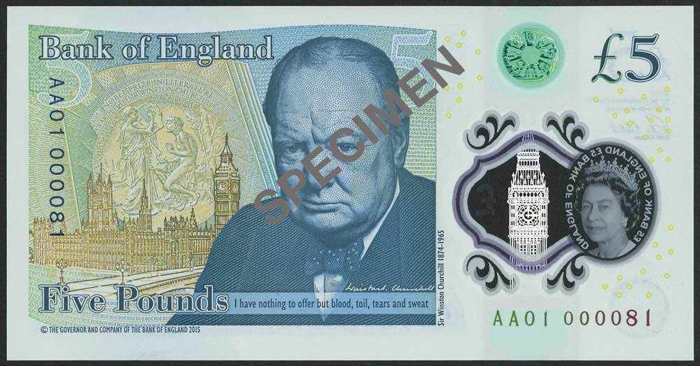 Bank of England, Victoria Cleland, £5 (3), ND (2016), serial number AA01 000081/82/83, printed on polymer, blue on green, Queen Elizabeth II at right, Bank of England building at low centre, see-through window security feature with metallic foil of Elizabeth Tower and clearly defined portrait of Queen Elizabeth II at left, reverse, Winston Churchill at centre, Houses of Parliament at left