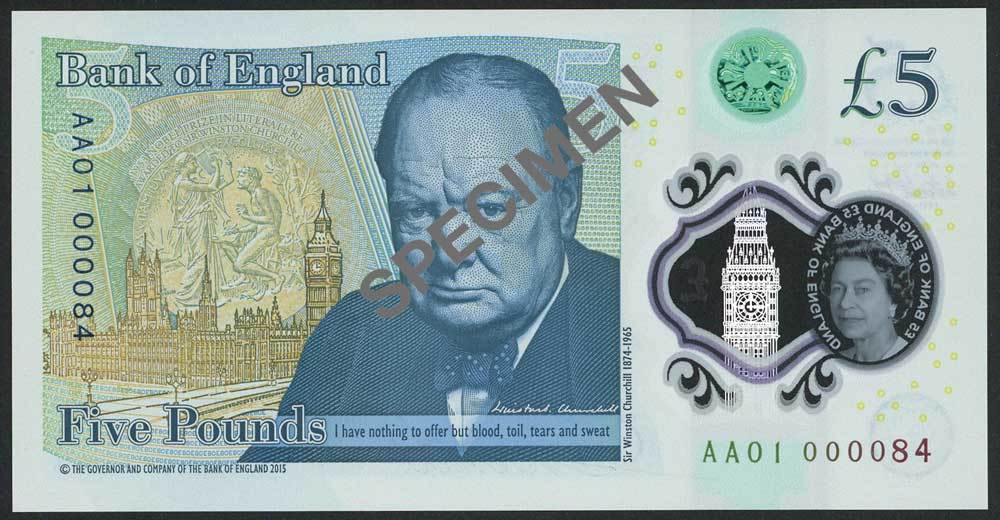 Bank of England, Victoria Cleland, £5 (4), ND (2016), serial number AA01 000084/85/86/87, printed on polymer, blue on green, Queen Elizabeth II at right, Bank of England building at low centre, see-through window security feature with metallic foil of Elizabeth Tower and clearly defined portrait of Queen Elizabeth II at left, reverse, Winston Churchill at centre, Houses of Parliament at left