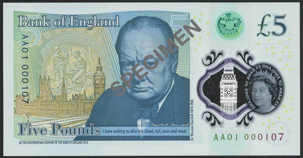 Bank of England, Victoria Cleland, £5 (2), ND (2016), serial number AA01 000107/108, printed on polymer, blue on green, Queen Elizabeth II at right, Bank of England building at low centre, see-through window security feature with metallic foil of Elizabeth Tower and clearly defined portrait of Queen Elizabeth II at left, reverse, Winston Churchill at centre, Houses of Parliament at left