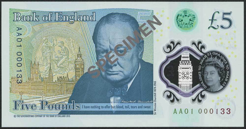 Bank of England, Victoria Cleland, £5 (3), ND (2016), serial number AA01 000133/134/135, printed on polymer, blue on green, Queen Elizabeth II at right, Bank of England building at low centre, see-through window security feature with metallic foil of Elizabeth Tower and clearly defined portrait of Queen Elizabeth II at left, reverse, Winston Churchill at centre, Houses of Parliament at left