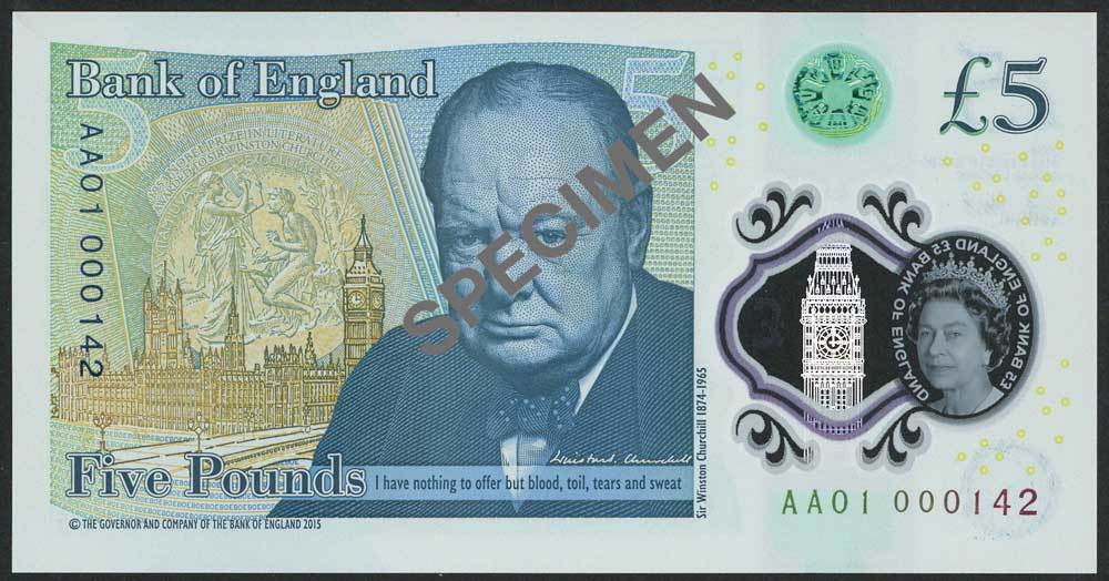 Bank of England, Victoria Cleland, £5 (3), ND (2016), serial number AA01 000142/143/144, printed on polymer, blue on green, Queen Elizabeth II at right, Bank of England building at low centre, see-through window security feature with metallic foil of Elizabeth Tower and clearly defined portrait of Queen Elizabeth II at left, reverse, Winston Churchill at centre, Houses of Parliament at left