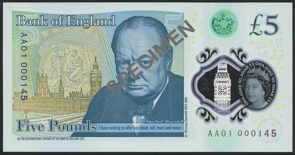 Bank of England, Victoria Cleland, £5 (3), ND (2016), serial number AA01 000145/146/147, printed on polymer, blue on green, Queen Elizabeth II at right, Bank of England building at low centre, see-through window security feature with metallic foil of Elizabeth Tower and clearly defined portrait of Queen Elizabeth II at left, reverse, Winston Churchill at centre, Houses of Parliament at left